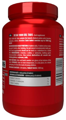 BCAA 1000 XXL Tabs enthalten verzweigtkettige Aminosäuren. BCAA-Aminosäuren machen ca. 35% der essentiellen Aminosäuren für den Muskelaufbau und fast 50% der Aminosäuren, die mit der Nahrung zugeführt werden müssen. 1000 mg in 1 Tablette! Zu den BCAA-Aminosäuren gehören: Leucin, Isoleucin und Valin. Sie kommen natürlich in der Nahrung vor, aber die Menge ist normalerweise nicht ausreichend. Leucin – das ist eine Aminosäure, die unser Körper nicht selbst herstellen kann. Sie erleichtert die Proteinsynthese im Körper und wirkt sich auch auf die Insulinwirkung aus. Diese Aminosäure trägt auch dazu bei, das anabole Fenster besser auszunutzen, was durch die verstärkte Wirkung von Insulin möglich ist, das die Glukosemenge im Blut reguliert. Isoleucin – Wenn die Fettsäuren unzureichend sind, wird es zur Energiequelle für die Muskeln. Es ermöglicht den Schutz der Muskeln, auch bei sehr intensivem Training. Valin – Nimmt eine aktive Rolle bei der Proteinsynthese ein. Es ist auch eine Aminosäure, die eine muskelaufbauende Wirkung hat. Wenn Isoleucin nicht in der Lage ist, alle Proteine vor Schäden zu schützen, hilft Valin, das zu reparieren, was das Training zerstört hat. Gleichzeitig wirkt diese Aminosäure dem Katabolismus entgegen.