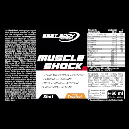 Der Best Body Nutrition Professional Muscle Shock ist der ultimative Trainingsbooster in der attraktiven 2-Komponenten-Ampulle. Die optimale Pump-Zusammenstellung aus Guarana, Koffein, Arginin, Beta-Alanin und einem Vitamin-Komplex ist ideal vor dem Training. Zusätzlich enthält der Muscle Shock eine ordentliche Der Best Body Nutrition Professional Muscle Shock ist der ultimative Trainingsbooster in der praktischen 60 ml Shotflasche. Er versorgt dich mit wichtigen Vitaminen, Magnesium, Aminosäuren und einer ordentlichen Portion Koffein, die dich unterstützen, wenn du das Maximum aus deinem Training herausholen willst.