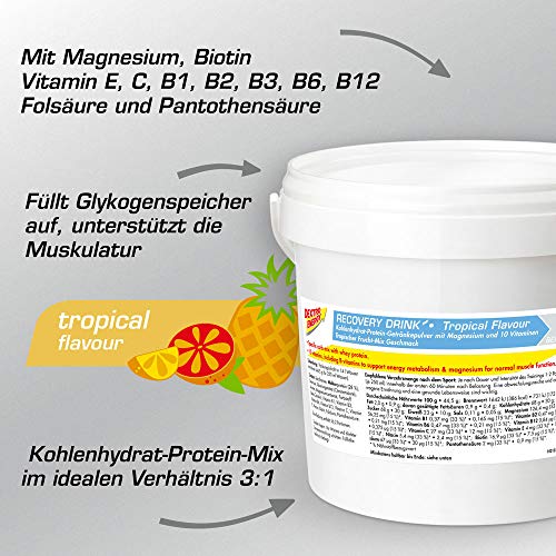 DEIN PROTEINPULVER MIT ZUSATZ VON KOHLENHYDRATEN UND NÄHRSTOFFEN – Und natürlich müssen Recovery Getränke magnesiumhaltig sein und dir eine ganze Bandbreite an wertvollen Vitaminen wie Vitamin C, B1 oder B12 bieten. Dies alles bekommst du mit dem Recovery Drink° von Dextro Energy*. Hier ist alles drin, was du für die Regeneration nach deinem Sport benötigst.