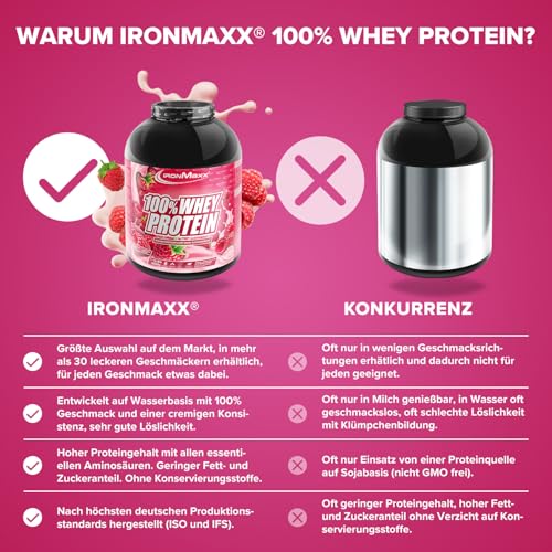 Das IronMaxx® 100% Whey Protein Pulver ist der ideale Begleiter für alle Sportler, die ihre Muskeln aufbauen, erhalten oder definieren möchten. Mit einem besonders hohen Proteingehalt und einem vollständigen Aminosäurenprofil aus BCAAs (Leucin, Isoleucin, Valin) und EAAs unterstützt es die Muskelregeneration nach dem Training und trägt zum Erhalt fettfreier Muskelmasse bei. Dank seiner schnellen Löslichkeit und cremigen Konsistenz überzeugt das Whey Protein in vielen leckeren Geschmacksrichtungen wie Schokolade, Vanille, Erdbeere, Cookies & Cream, Haselnuss, Latte Macchiato und vielen weiteren Sorten. Ob als Shake mit Wasser oder Milch, zum Verfeinern von Joghurt, Quark oder beim Backen – das IronMaxx Whey Protein bietet maximale Vielseitigkeit. Mit seinem niedrigen Zucker- und Kohlenhydratanteil eignet sich das Eiweißpulver perfekt für Muskelaufbau, Diät, Fitness und Bodybuilding. Entwickelt und hergestellt in Deutschland steht IronMaxx® für höchste Qualität, Sicherheit und Genuss in der Sporternährung.