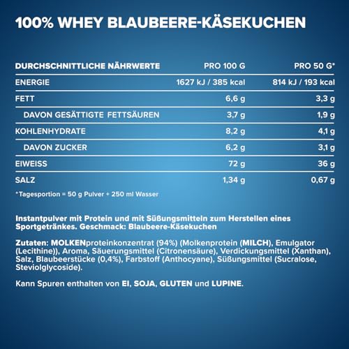 Molkeneiweißkonzentrat (MILCH) (94%) (enthält Emulgator (Lecithine)), Aroma, Säuerungsmittel (Citronensäure), Verdickungsmittel (Xanthan), Salz, Blaubeerstücke (0,4%), Farbstoff (Anthocyane), Süßungsmittel (Sucralose, Steviolglycoside aus Stevia).
