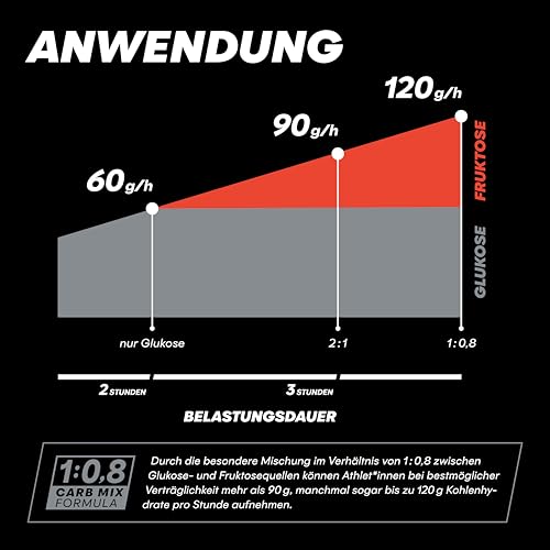 MAXIMALE ENERGIE FÜR DEINE HÖCHSTLEISTUNGEN mit dem Kohlenhydratverhältnis von 1:0,8 der Glukose- und Fruktosequellen kannst du jetzt mehr als 90 g, bei stetem Training sogar bis zu 120 g Kohlenhydrate pro Stunde aufnehmen