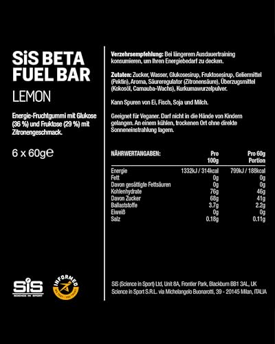 Als Ausdauersportler, der seinen Körper in der Regel länger als zwei Stunden belastet, musst du zwischen 80 und 120 g Kohlenhydrate pro Stunde zu dir nehmen. Unsere SiS Energy Gel Chew Riegel liefern 46 g schnelle Kohlenhydrate in Form eines praktischen und schmackhaften Riegels. Verzehrempfehlung: Jeder Chew-Riegel enthält 46 Gramm Kohlenhydrate. Je nach Sportart oder Veranstaltung solltest du versuchen, während der Anstrengung 1-3 Power Riegel pro Stunde zu verzehren, um eine Zielzufuhr von 80 g bis 120 g zu erreichen. Inhaltsstoffe: Zucker, Wasser, Glukosesirup, Fruktosesirup, Geliermittel (Pektin), Aroma, Säureregulator (Zitronensäure), Maisstärke, Überzugsmittel (Kokosnussöl, Carnaubawachs), Farbstoff (Kurkumaextrakt) – keine Allergene Was wir machen: Das Science in Sports Innovation Centre in Lancashire ist eine von Informed-Sport akkreditierte Einrichtung. Alle unsere Produkte werden von Sportwissenschaftlern und Ernährungswissenschaftlern erforscht und entwickelt, die mit Weltklasse-Athleten zusammenarbeiten. Diese wissenschaftliche Forschung bildet die Grundlage für alles, was wir tun. Durch die enge Zusammenarbeit mit Weltklasse-Athleten bekommen wir konstantes Feedback und haben unsere Produkte nach bestmöglichem Standard optimiert. Dies gibt uns einen enormen Qualitätsvorsprung.